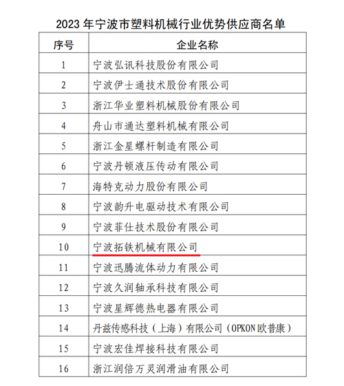 根據《關于開展 2023 年度寧波市塑料機械行業優秀供應商評選活動的通知》(甬塑機〔2023〕2 號)文件要求,通過單位推薦和協會提名,最終在 2023 年 4 月 16 日第五屆十一次理事會上投票選舉產生了 16 家企業為“2023 年度寧波市塑料機械行業優勢供應商”。我司有幸獲此殊榮,歸功于平日里每一位辛勤付出的員工。